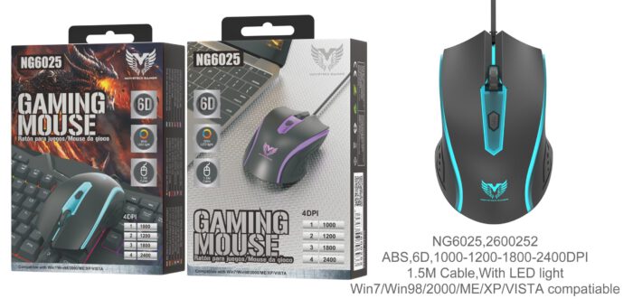 • NG6025 NE Raton Gaming 6D con cable 1.5M, DPI 1000-1200-1600-2400, Luz RGB, Negro