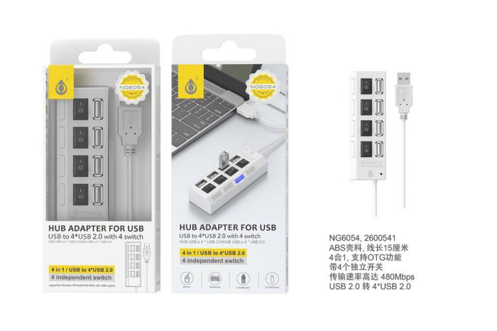 NG6054 BL lector USB Hub con 4 entrada USB Con Interruptor ON/OFF ,Blanco