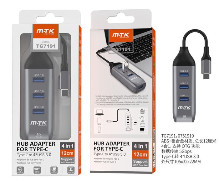 • TG7191 GR Hub USB3.0 4 en 1, Type C a 4USB 3.0, 5Gbps, Longitud 0,12M, Gris
