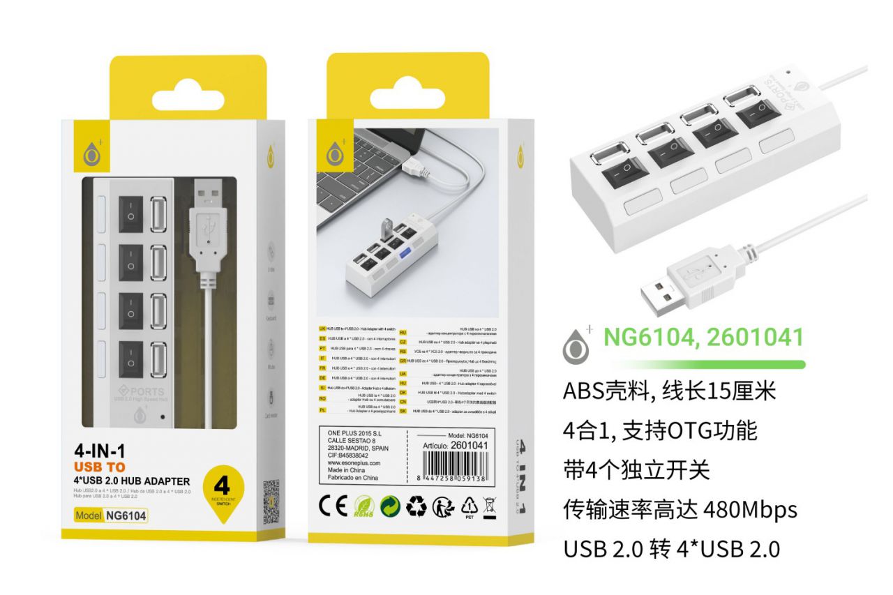 • NG6054 BL lector USB Hub con 4 entrada USB Con Interruptor ON/OFF ,Blanco