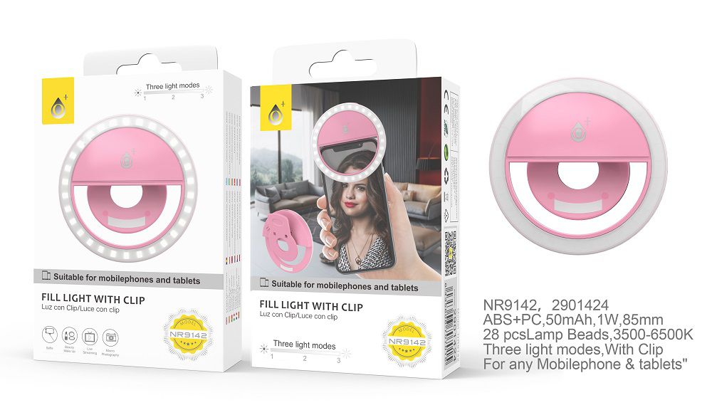NR9142 RS Mini Anillo Luz LED con Clip Universal para Moviles, 3 Niveles de Brillo, Rosa