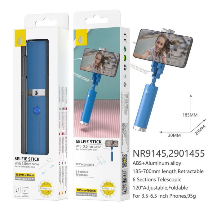 NR9145 AZ Palo Selfie Universal con Cable de Jack 3.5mm, Compatible con Moviles de 3.5 - 6.5 Pulgadas, Longitud de 18.5cm-70cm, Azul