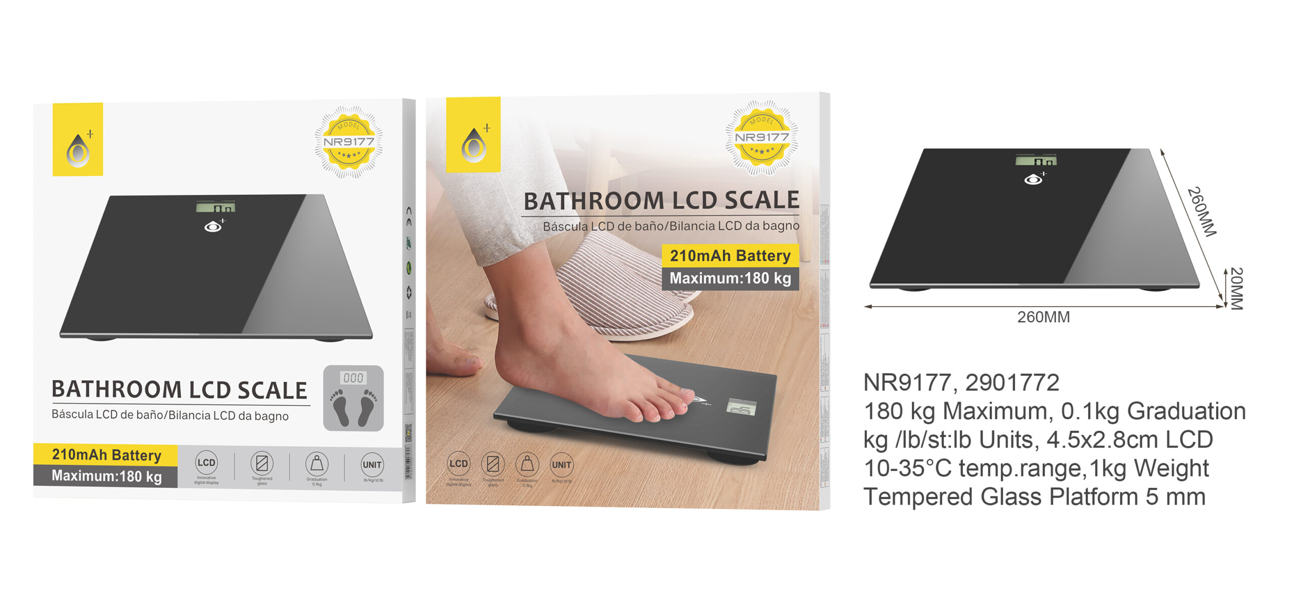 NR9177  NE Bascula de bano con Pantalla LCD, Capacidad de 180 kg , Con Plataforma de Vidrio y Apagado Autom醫ico, Incluye Pilas, Negro