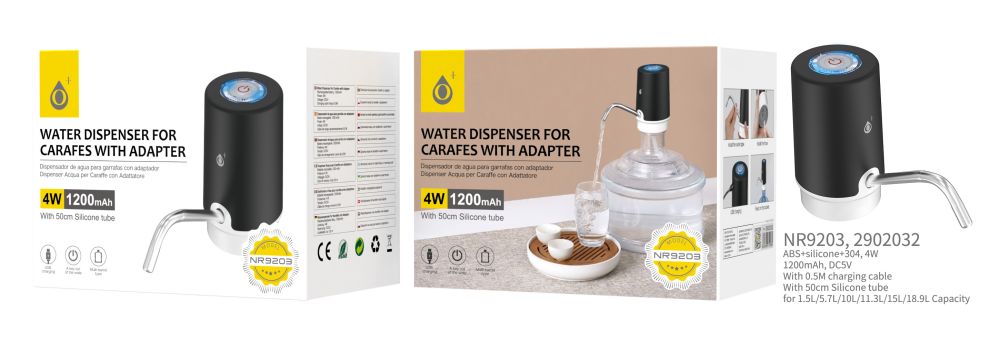 NR9203 NE Dispensador de agua con adaptador,Cable USB y Tubo de Silicona de 50cm,Volumen admitida: 1,5L/5,7L/10L/11,3L/15L/18,9L, 4W, Negro