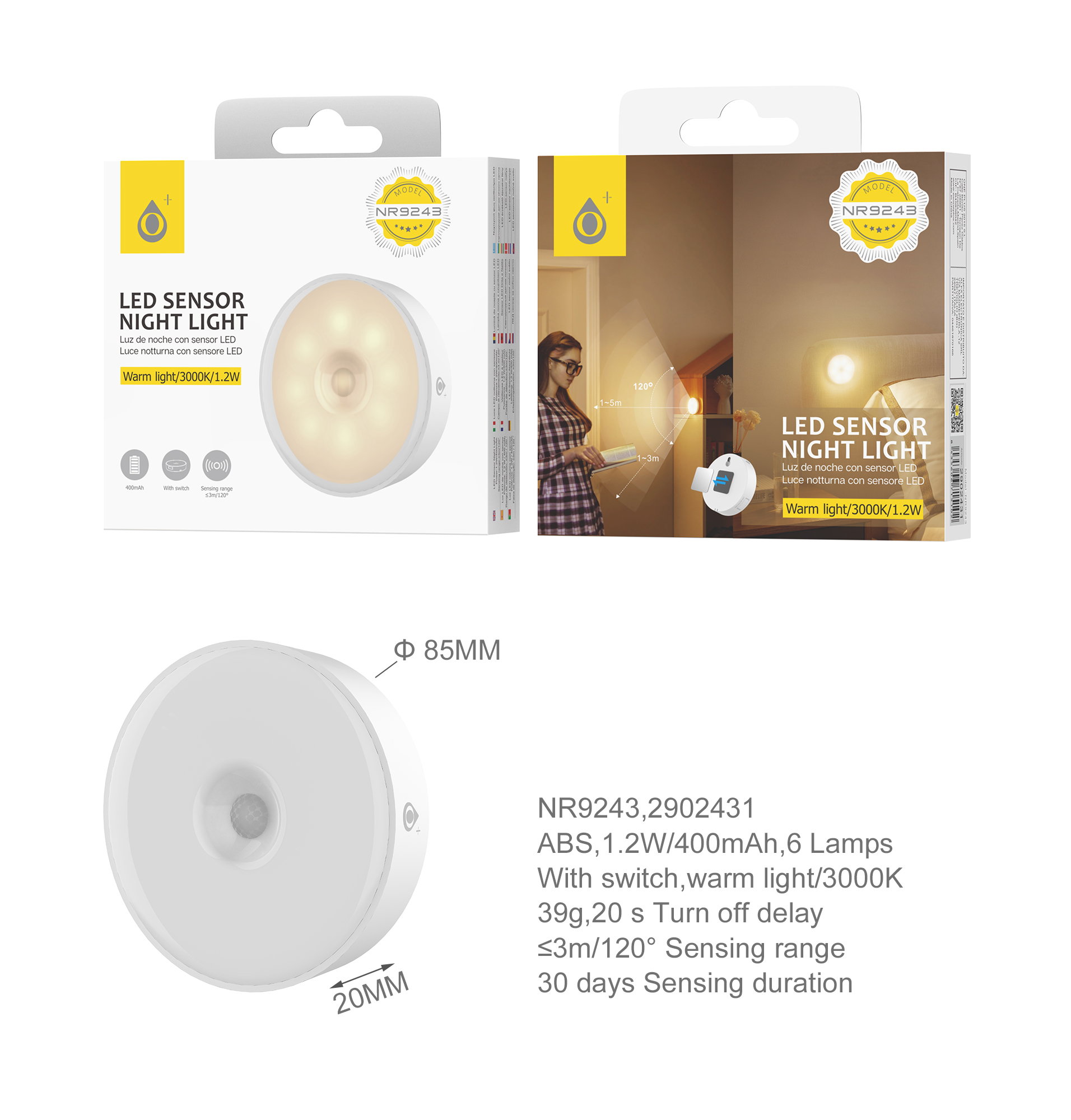 NR9243 BL Luz de Noche con sensor de LED, Tiempo Sensor 20s, Ranco de deteccion 120? Con interruptor, 1.2W, Blanco