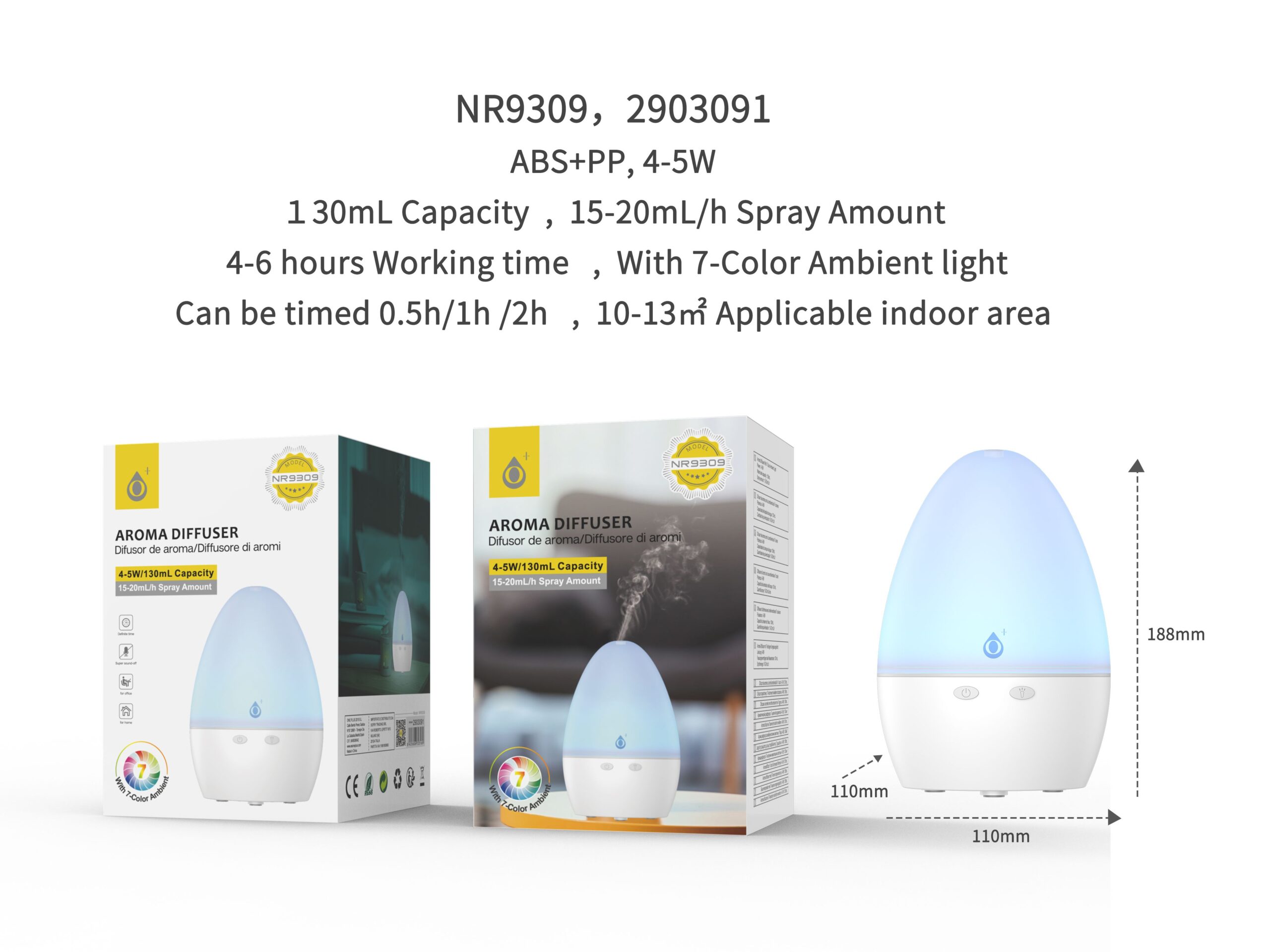 NR9309 BL Humificante Aroma Air Luz Ambiental 7 color , Temporizador hasta 2 Horas,Capacidad 130mL ,15-20ml/H , 5W, Blanco