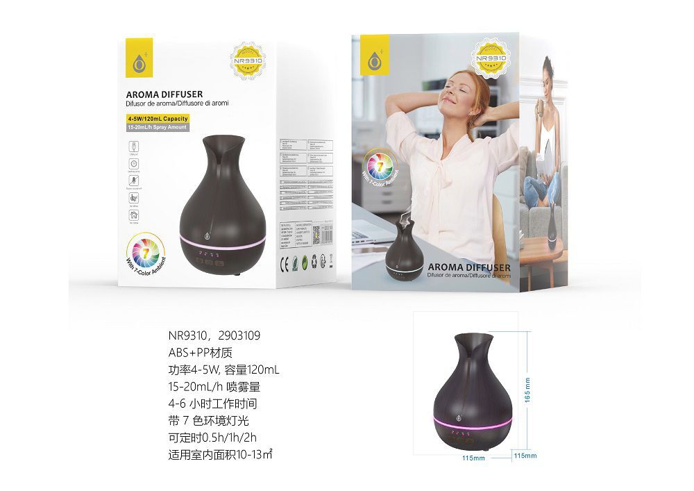 NR9310 NE Humificante Aroma Air Luz Ambiental 7 color , Temporizador hasta 2 Horas,Capacidad 120mL ,15-20ml/H , 5W, Negro