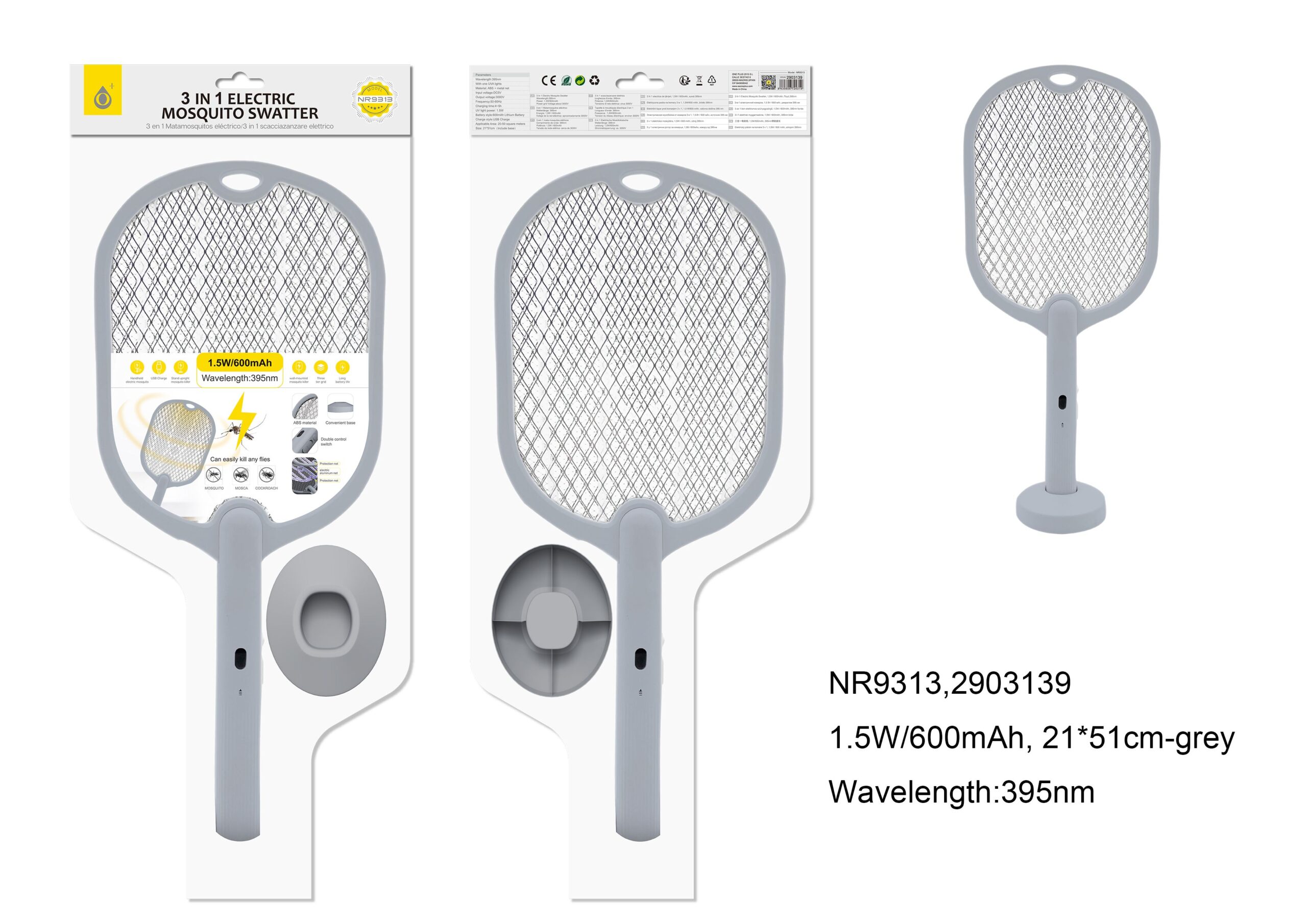 NR9313 GR Raqueta Matamosquitos Electrico con Base, Tres Capas, long de onda 395nm, 600mAh/1.5W, Gris