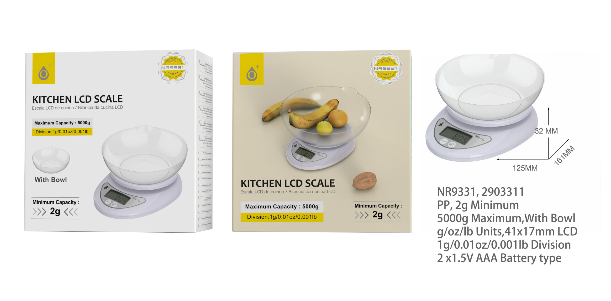 NR9331 BL Bascula de Cocina con cuenco, con Pantalla LCD, Capacidad Max.5000g (Min.2g),Max desviacion 1g/0.1oz/0.001lb Bateria 2*AAA (No incluye), Bla