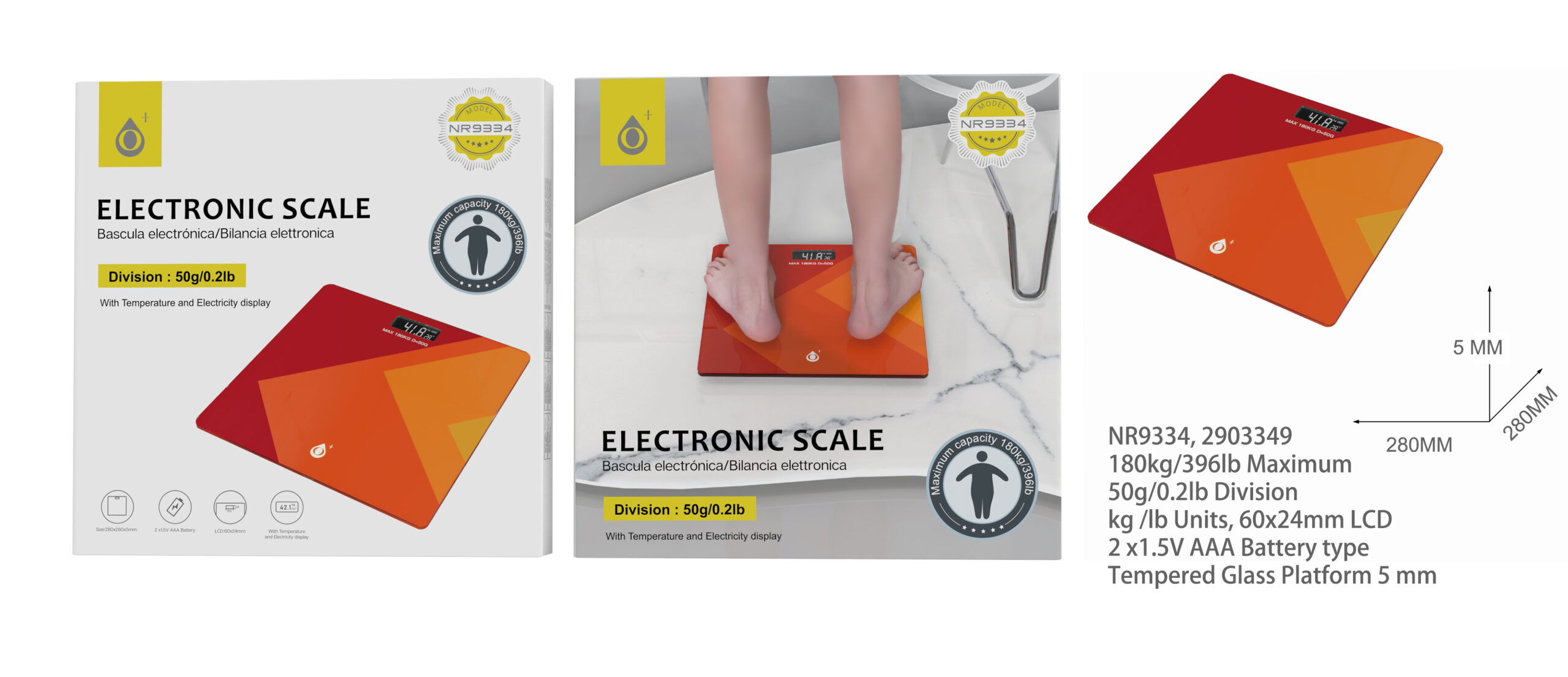 NR9334 NR Bascula Electronica con plataforma de vidrio templado de 5 mm,Pantalla LCD, MAX 180kg/ 396lb,  Max desviacion 50g/0.2lb, 2xAAA (No Incluido),  Naranja