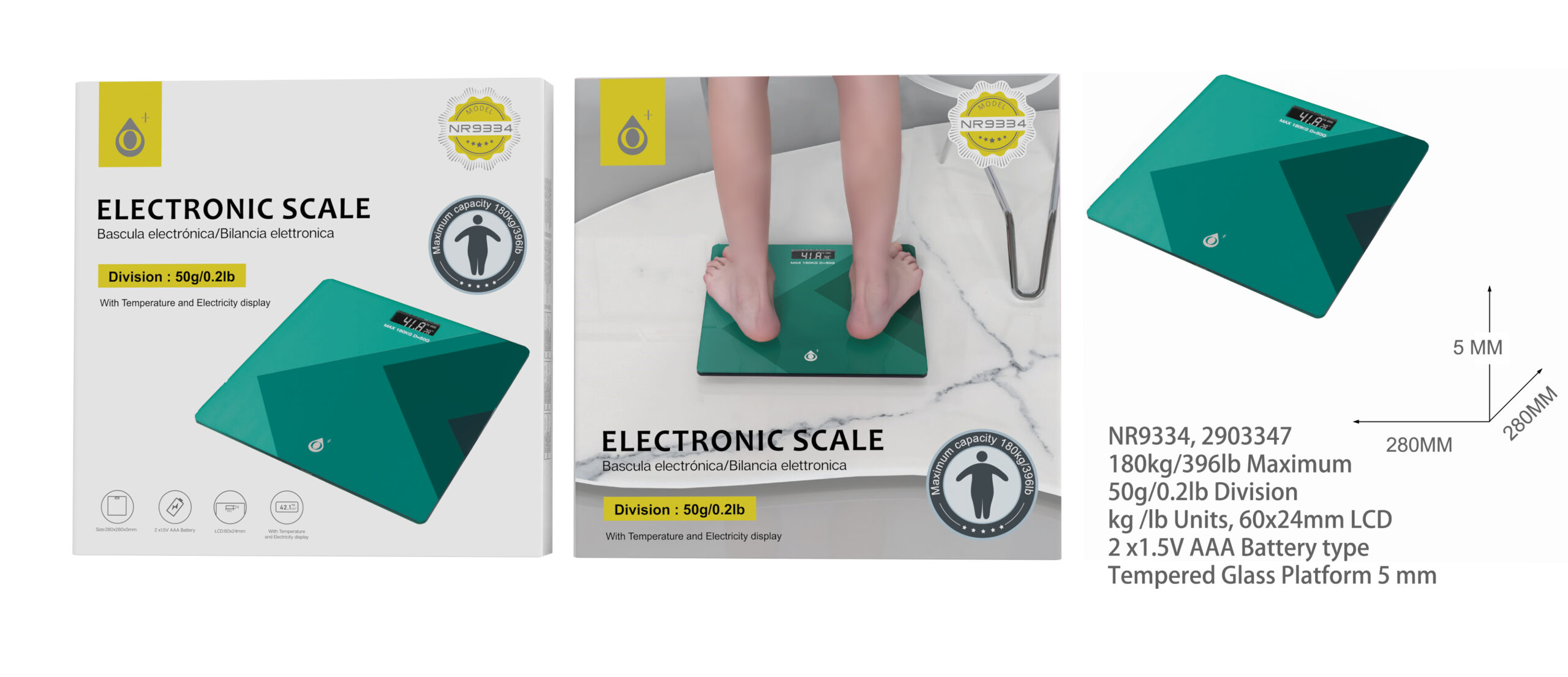 NR9334 VT Bascula Electronica con plataforma de vidrio templado de 5 mm,Pantalla LCD, MAX 180kg/ 396lb,  Max desviacion 50g/0.2lb, 2xAAA (No Incluido),  Verde Turquesa