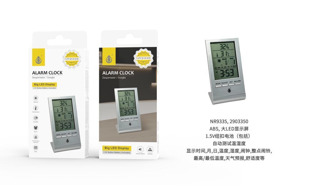 NR9335 PT Roloj Despertador digital LED,con control de temperatura y humedad automatico,Incluye bateria de boton 1.5V,Plata
