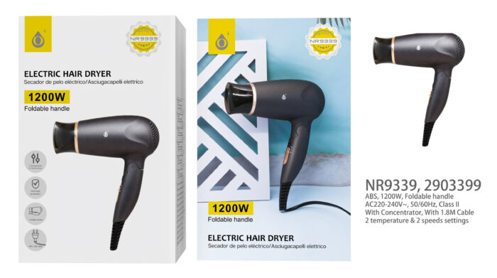 NR9339 NE Secador de Pelo Plegable, 2 Temperaturas y 2 Velocidades , con Concentrador, 1200W,Cable 1.8M, Negro