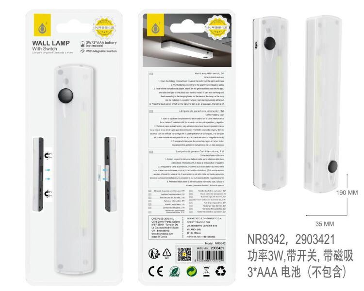 NR9342 BL Lampara LED de Pared, magnetica ,con interruptor ON/OFF,3W,