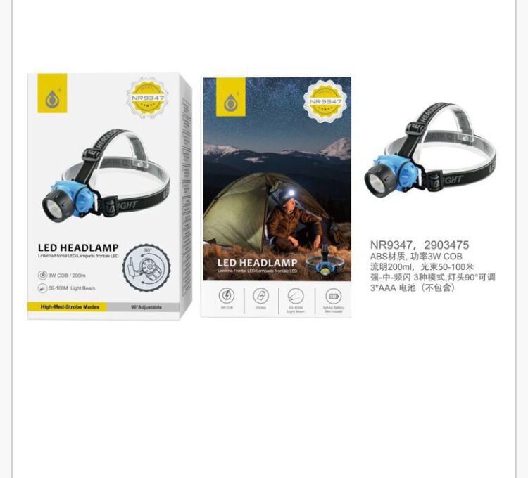 NR9347 AZ Linterna Frontal led 3W con 3 modos luz(Fuerte, Medio y Estroboscopica),Cabezal con giro ajustable 90°,