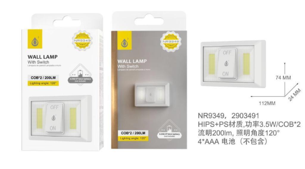 NR9349 BL Lampara de Pared LED 3.5W 200LM con interruptor ON/OFF y angulo de luz 120°, Bateria 4*AAA(NO incluye), Blanco