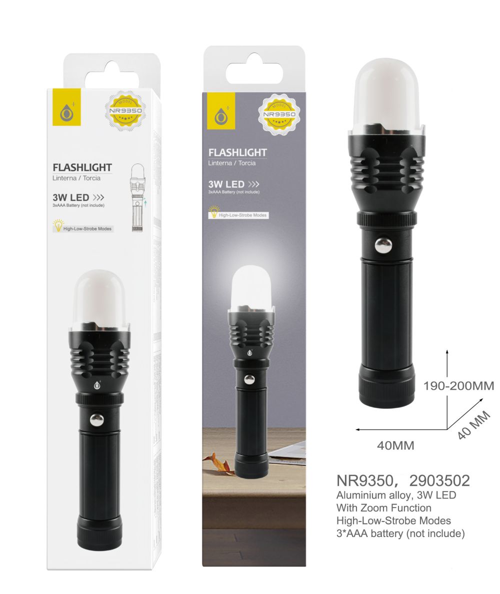 NR9350 NE Linterna LED de aluminio con funcion Zoom,3 modos de luz (Fuerte,bajo y estroboscopica),  3W Bateria 3*AAA(No incluye), Negro