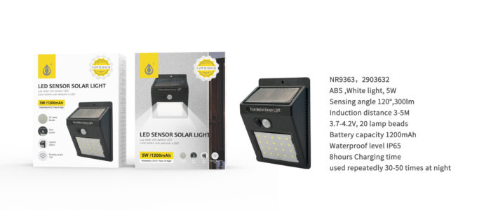NR9363 NE Lampara solar LED con 20 luces para exterior, con sensor de movimiento 3-5m, Angulo de 120°,IP65,5W/1200mAh/3.7-4.2v/300lumen, Negro