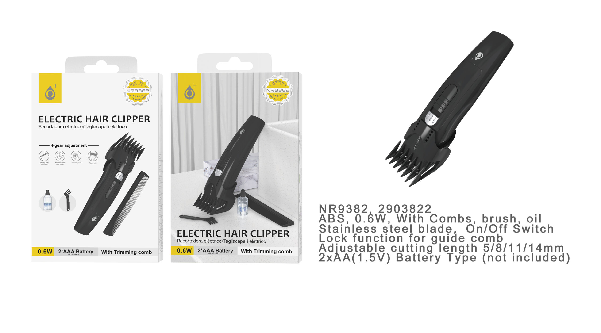 NR9382 NE Maquina Cortarpelo con peine , con 4 posiciones ( incluye  kit de limpieza ),Bateria 2*AAA NO Inluida 0.6W, Negro