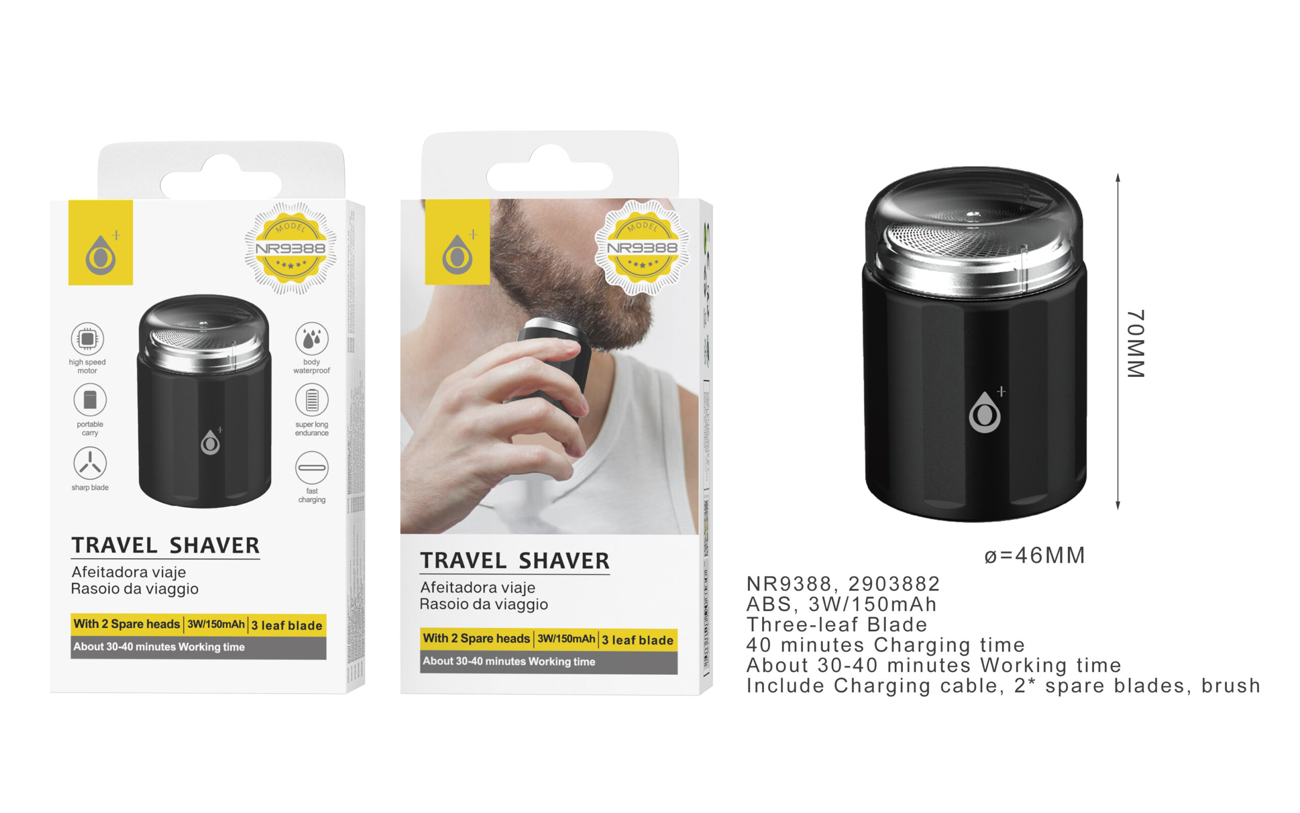 NR9388 NE Afeitadora electrica de viaje, Triple hoja de cuchillas, Bateria 3w/150mAh, Incluye 2 cabezales recambios  y cepillo de limpieza, Negro