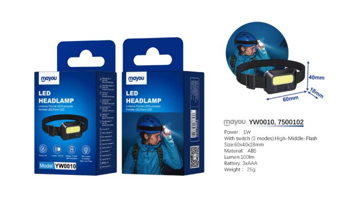 • YW0010 NE Linterna Frontal led COB 1W/100lumenes, 3 modos(Alto/Bajo/Funcion de destello), Bateria AAA*3 No incluido