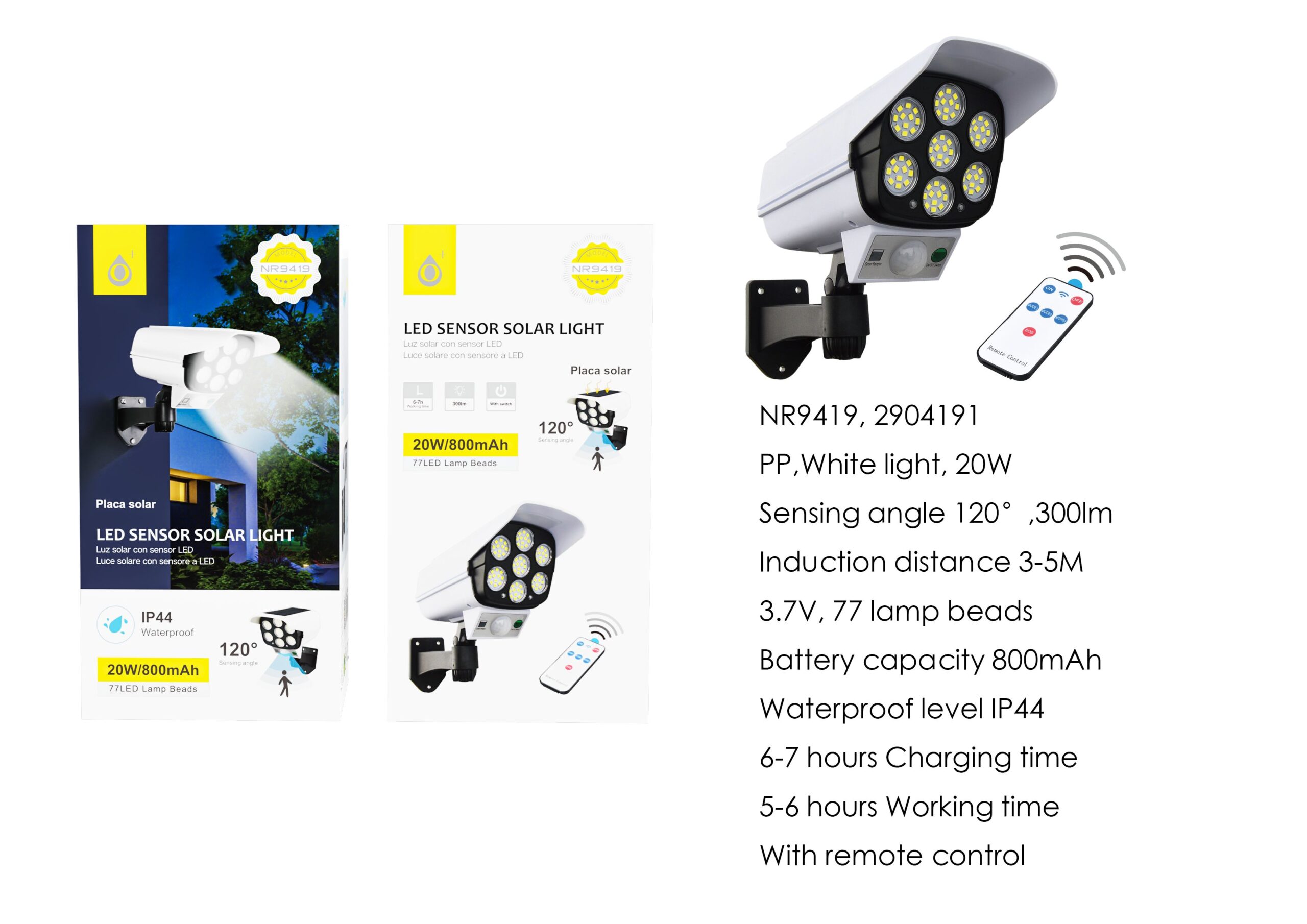 NR9419 NE Lampara solar LED con 77 luces para exterior incluye mando, con sensor de movimiento 3-5m, Angulo de 120°,IP44,20W/800mAh/3.7v/300lumen, Negro