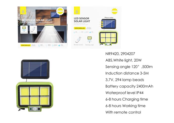 NR9420 NE Lampara solar LED con 294 luces para exterior incluye mando, con sensor de movimiento 3-5m, Angulo de 120°,IP44,20W/2400mAh/3.7v/500lumen, Negro