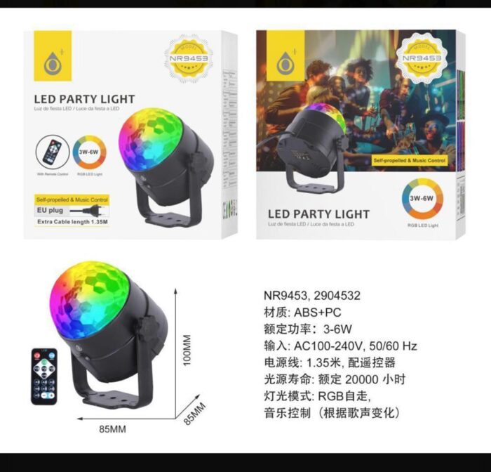 NR94253 NE Luces de Fiesta, Luz LED RGB y Control de sonido, Incluye mando a distancia 3-6W, Con cable 1.35M, Negro