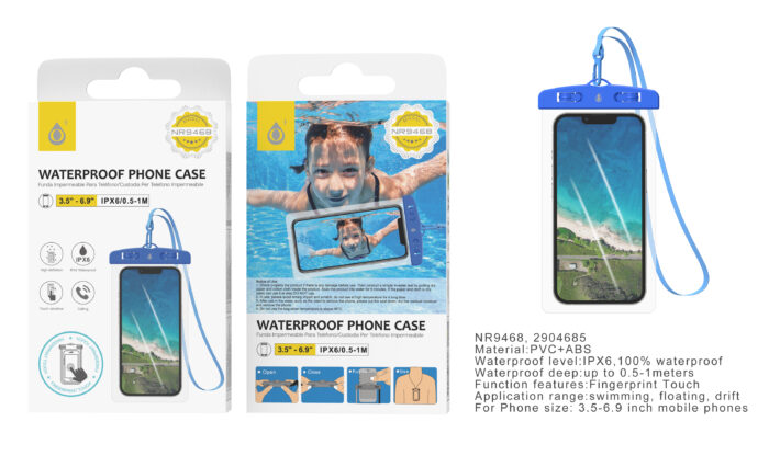 NR9468 AZ Funda impermeable con correa, Tactil para Movil 3.5-6.9 Pulgada, IPX6 Profundidad 0.5-1M, Azul
