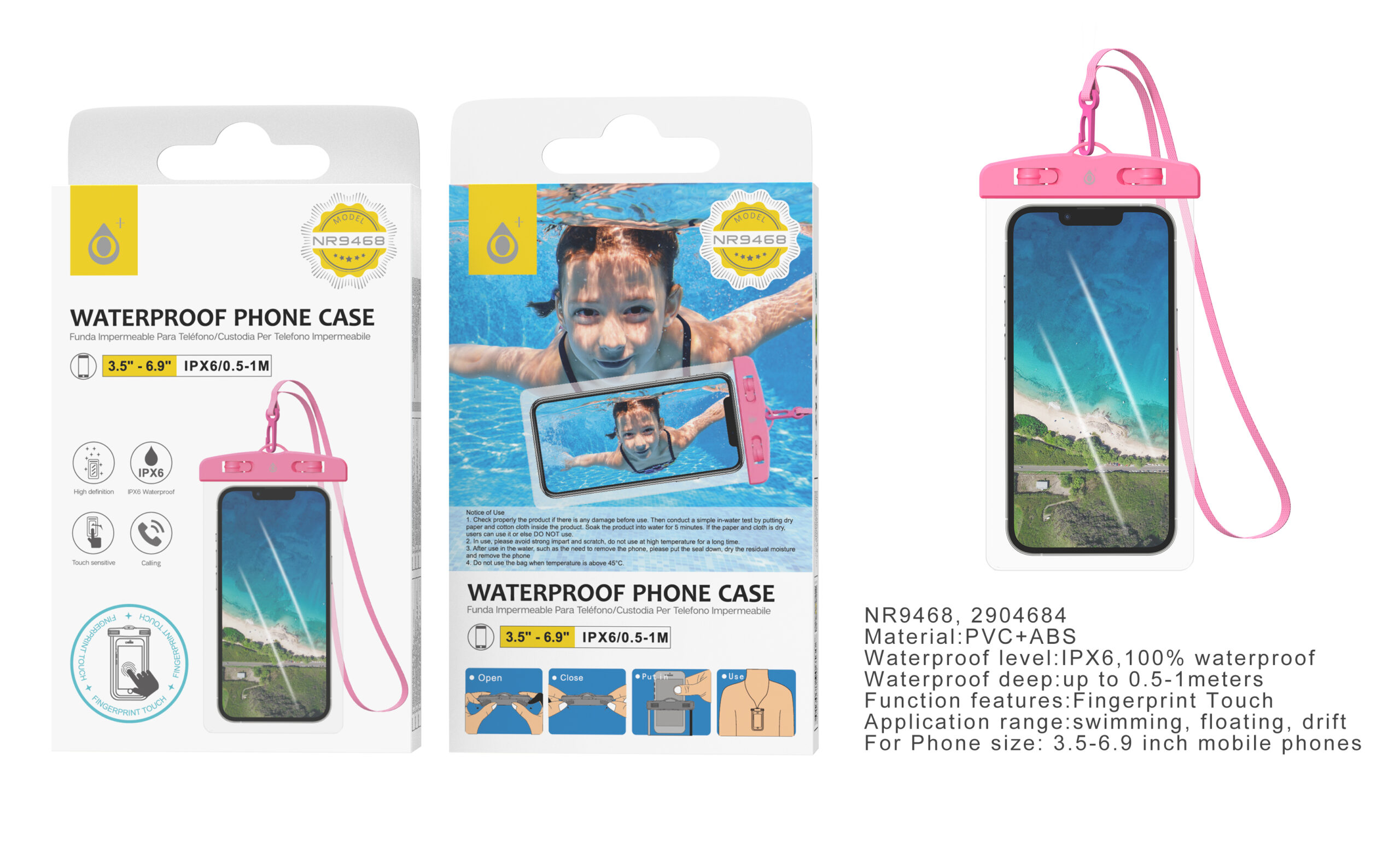 NR9468 RS Funda impermeable con correa, Tactil  para Movil 3.5-6.9 Pulgada, IPX6 Profundidad 0.5-1M, Rosa
