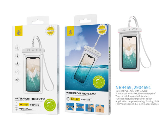 NR9469 BL Funda impermeable con correa, Tactil para Movil 3.5-6.9 Pulgada, IPX6 Profundidad 1-2M,  Blanco