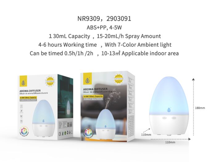 • NR9310 MA Humificante Aroma Air Luz Ambiental 7 color , Temporizador hasta 2 Horas,Capacidad 120mL ,15-20ml/H , 5W, Marron