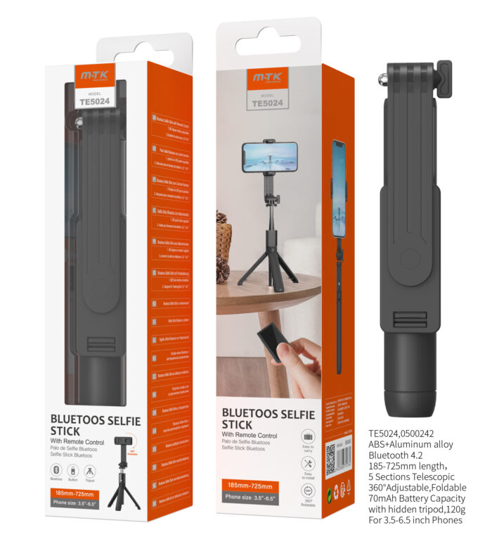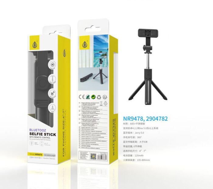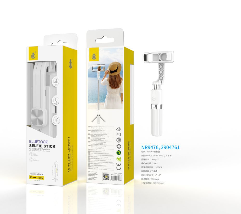NR9476 BL Palo Selfie con Tripode flexible 360°, Bluetooth Incluye mando, Para movil 4-7 Pulgadas, Bateria 120mAh, 16-73.5CM, Blanco