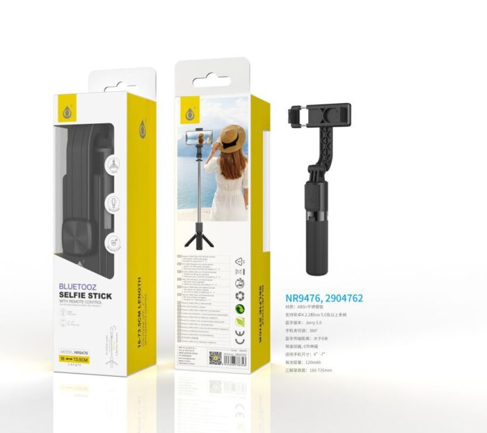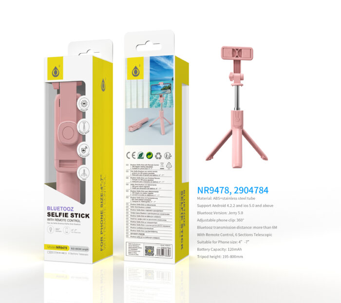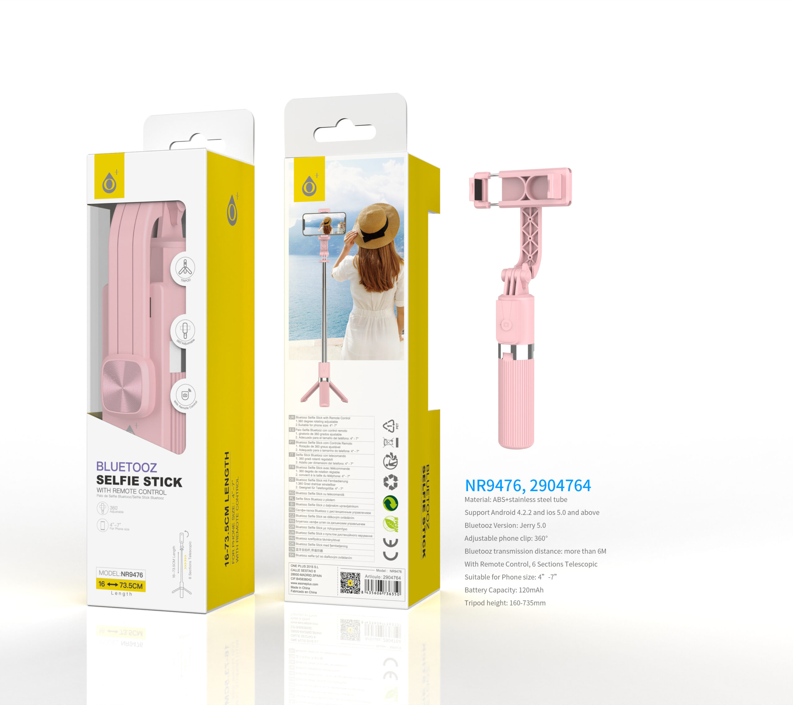 NR9476 RS Palo Selfie con Tripode flexible 360°, Bluetooth Incluye mando, Para movil 4-7 Pulgadas, Bateria 120mAh, 16-73.5CM, Rosa