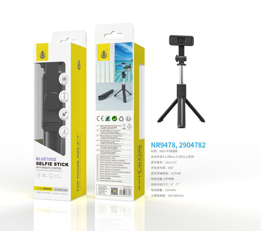 NR9478 NE Palo Selfie con Tripode flexible 360°, Bluetooth Incluye mando, Para movil 4-7 Pulgadas, Bateria 120mAh, 19.5-80CM, Negro