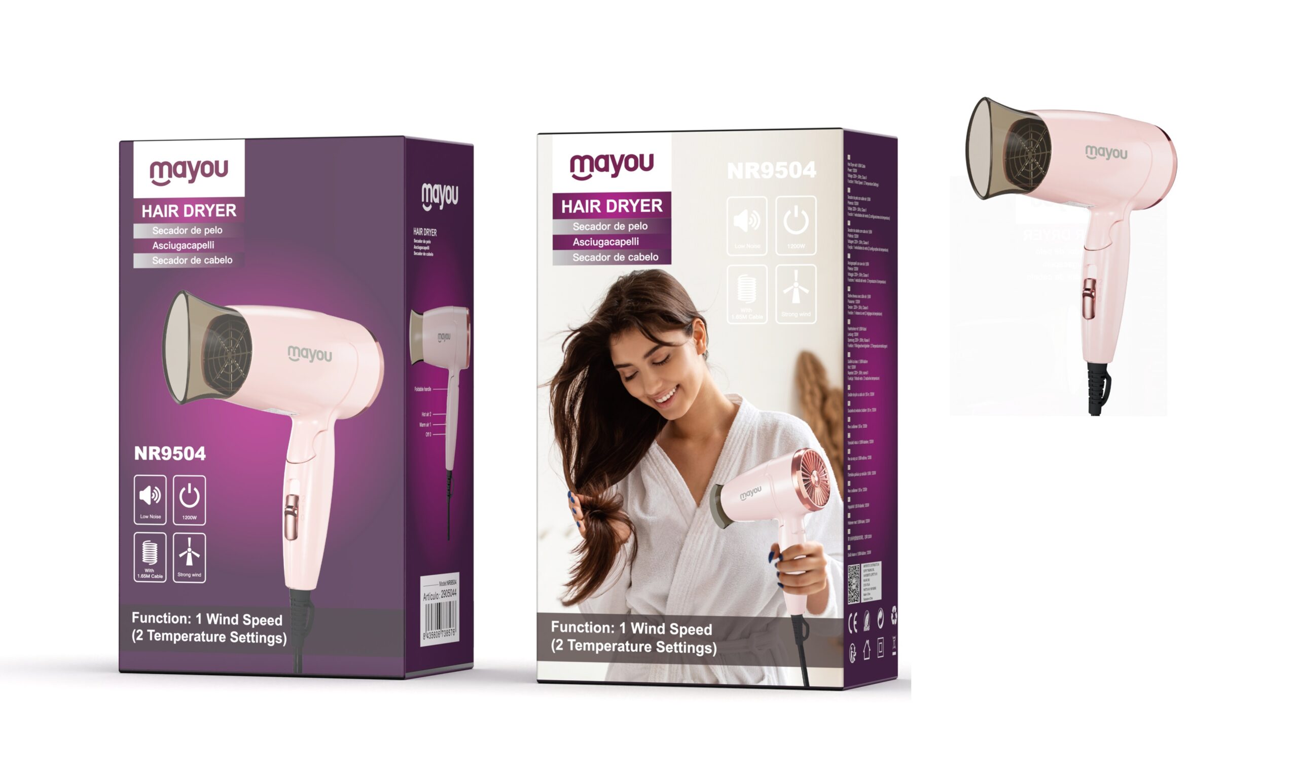 NR9504 RS Secador de pelo Plegable con 1 velocidades,2 niveles temperatura, Cable 1.65m, 1200w, Blanco