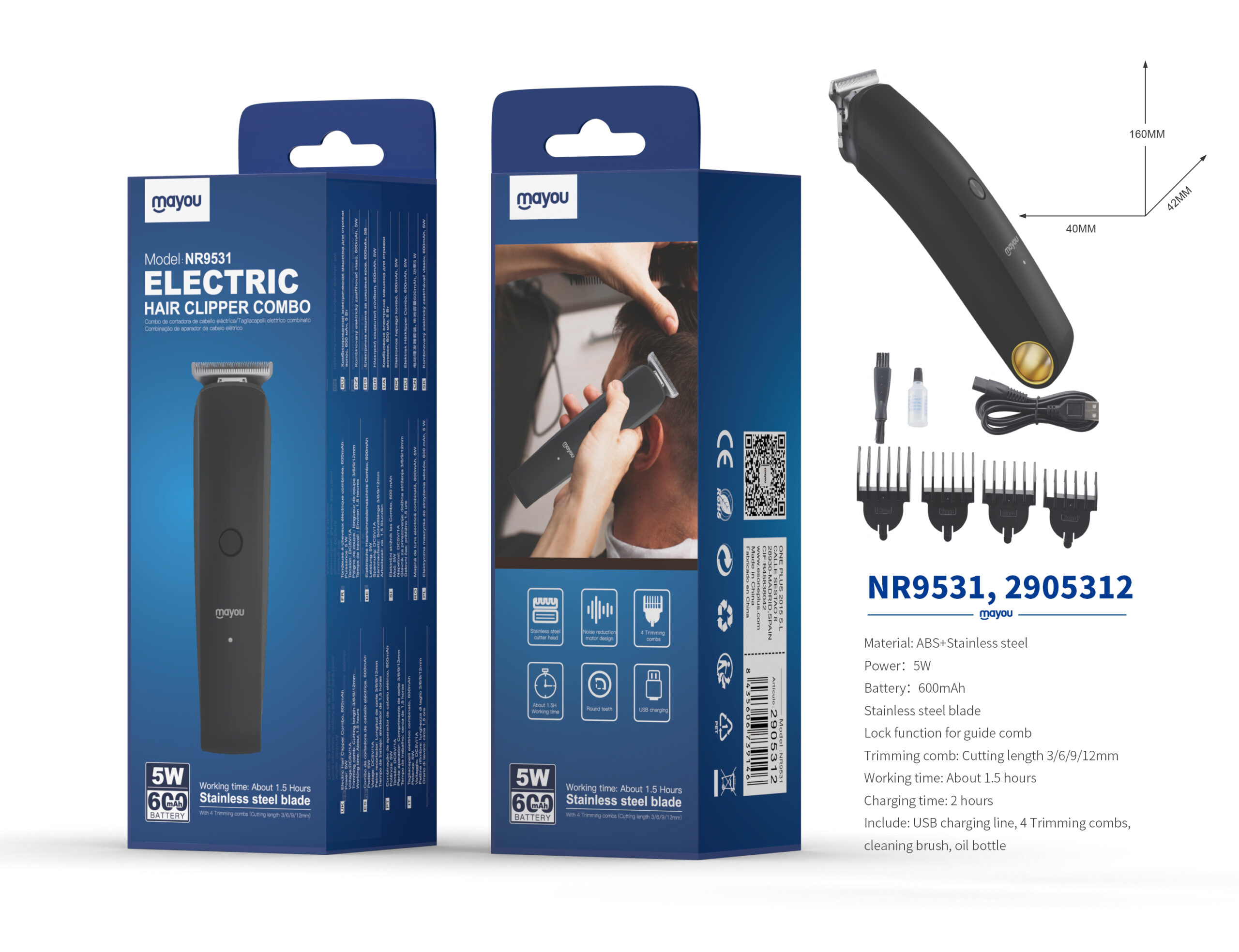 NR9531 NE Maquina Cortarpelo con 4 peines( incluye kit de limpieza y un peine ),Bateria 600mAh/5W, Negro