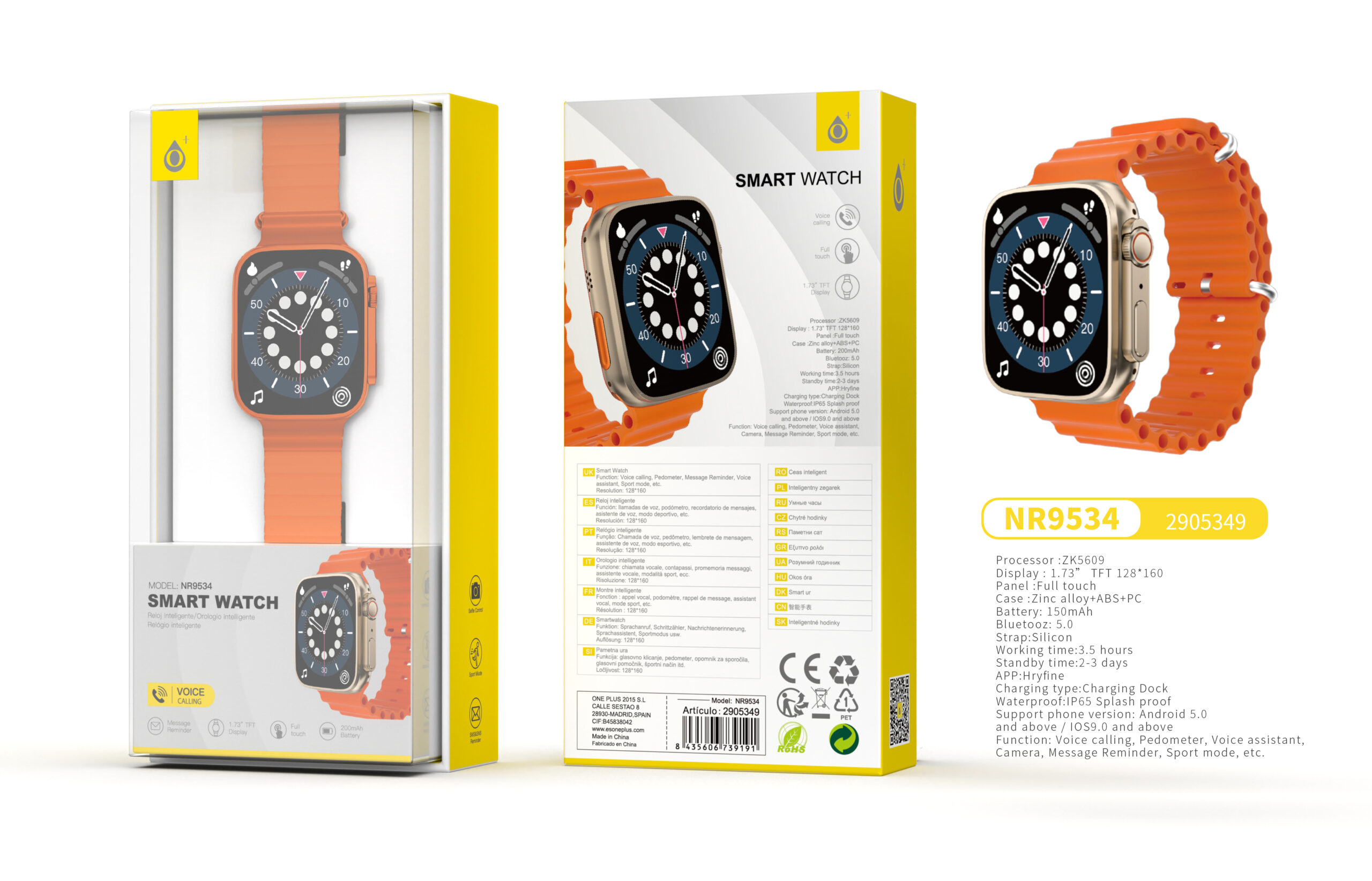 NR9534 OR Reloj Inteligente con bluetooth 5.0, Pantalla tactil de 1.73 pulgadas, Soporta llemadas, Asistente de Voz,Impermeable IP65, Bateria 150mAh, Soporta Andriod y IOS, Oro