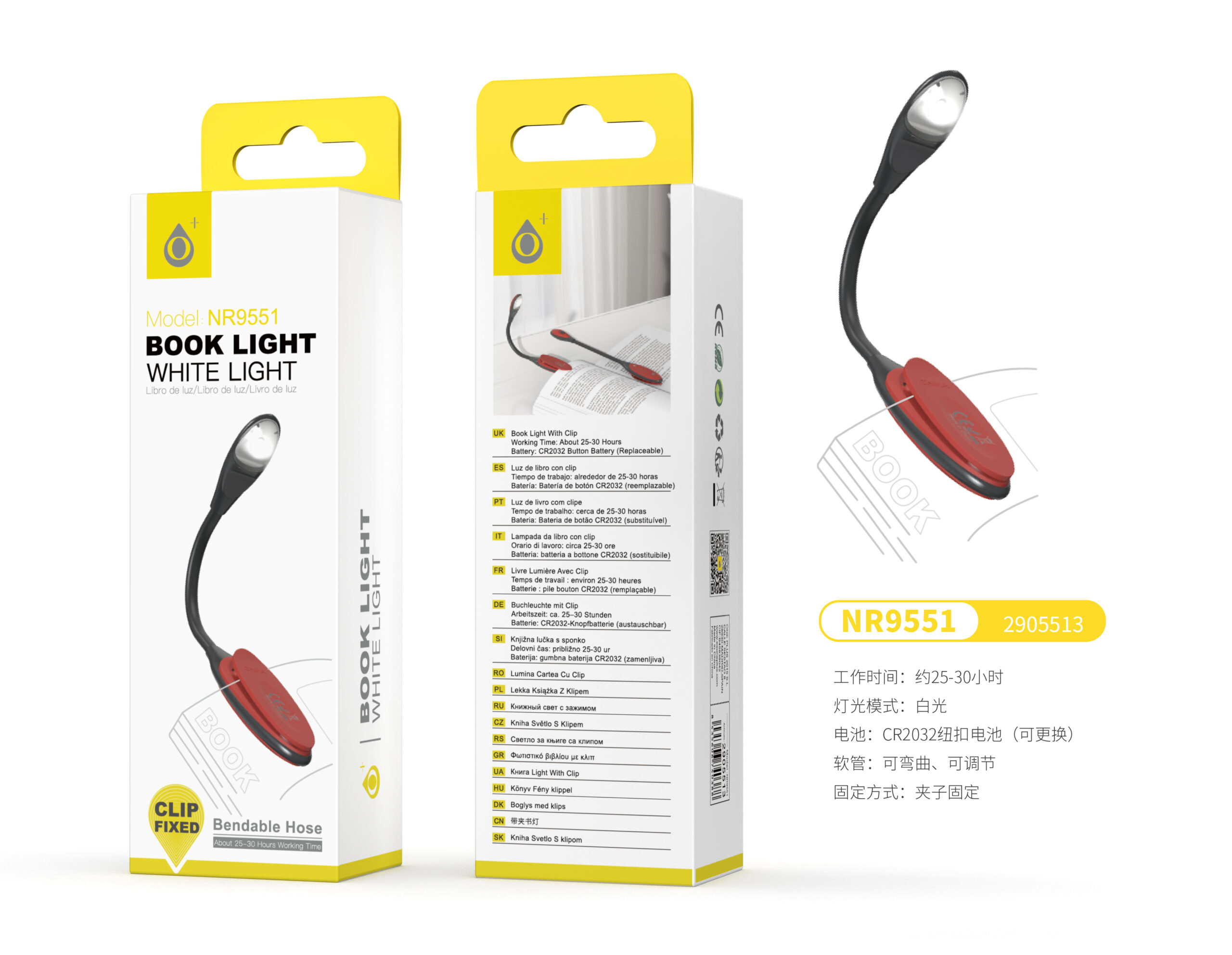 NR9551 NE+RJ Mini Lampara de Libro con Pinza, Luz fria, Brazo flexible, Bateria de Boton CR2032(Incluido), Negro+Rojo