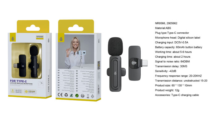 NR9566 NE Mini Microfono Type-C Bluetooth con Clip, Compatible con Apple, Bateria 60 mAh, Negro