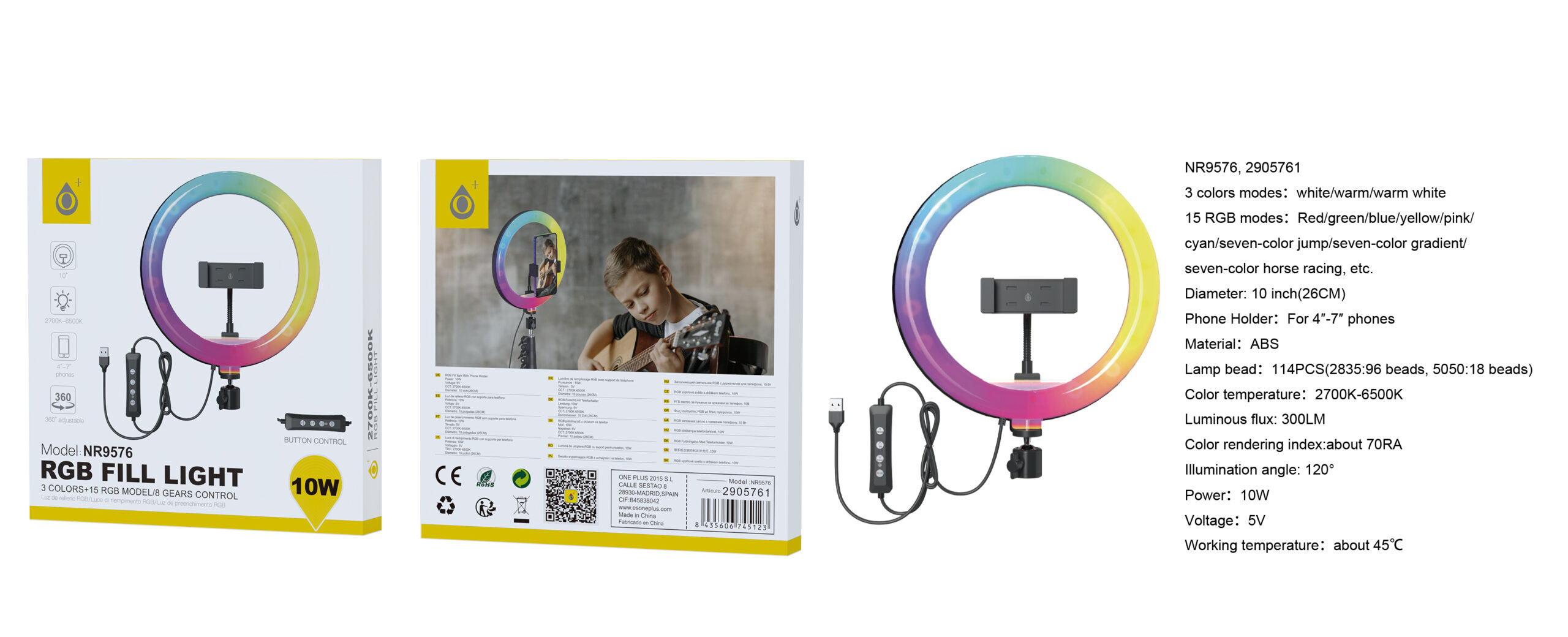 NR9576  NE Anillo de Luz con soporte de movil, Arco 10 Pulgadas Luz RGB 2700-6500K/300LM/114 luces, para movil 4-7 pulgadas, Negro