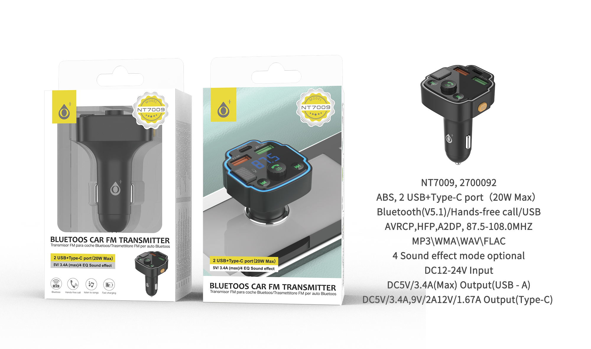 NT7009 NE Transmisor FM con 2 USB+1 PD (20W Max) , Bluetooth 5.1 y Boton Multifuncional