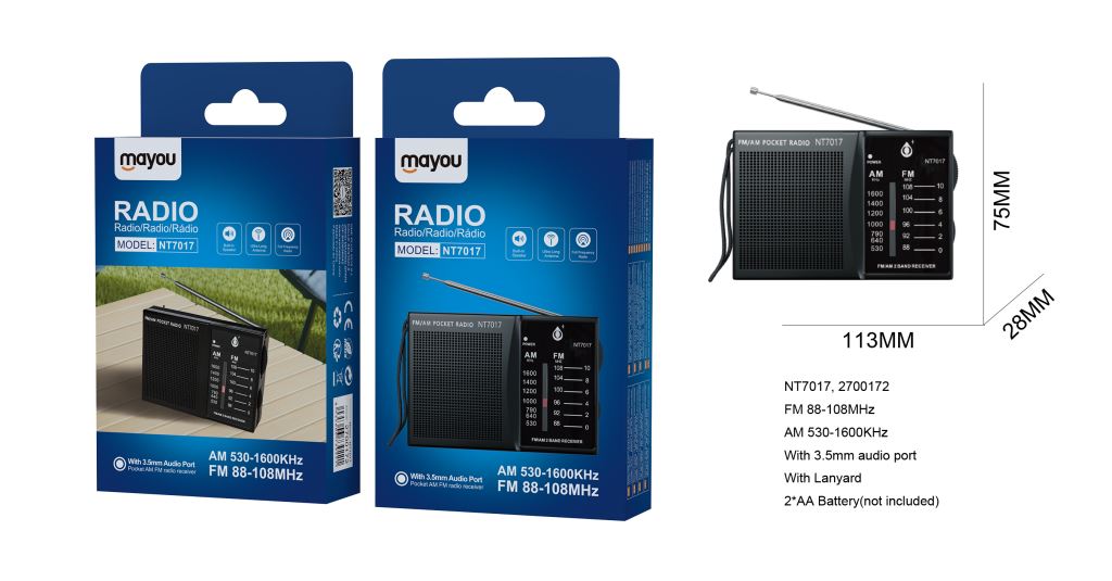 NT7017 NE Radio portatil AM/FM con Antena y correa , Entrada de jack 3.5mm, Bateria 2*AA (No incluida), Negro
