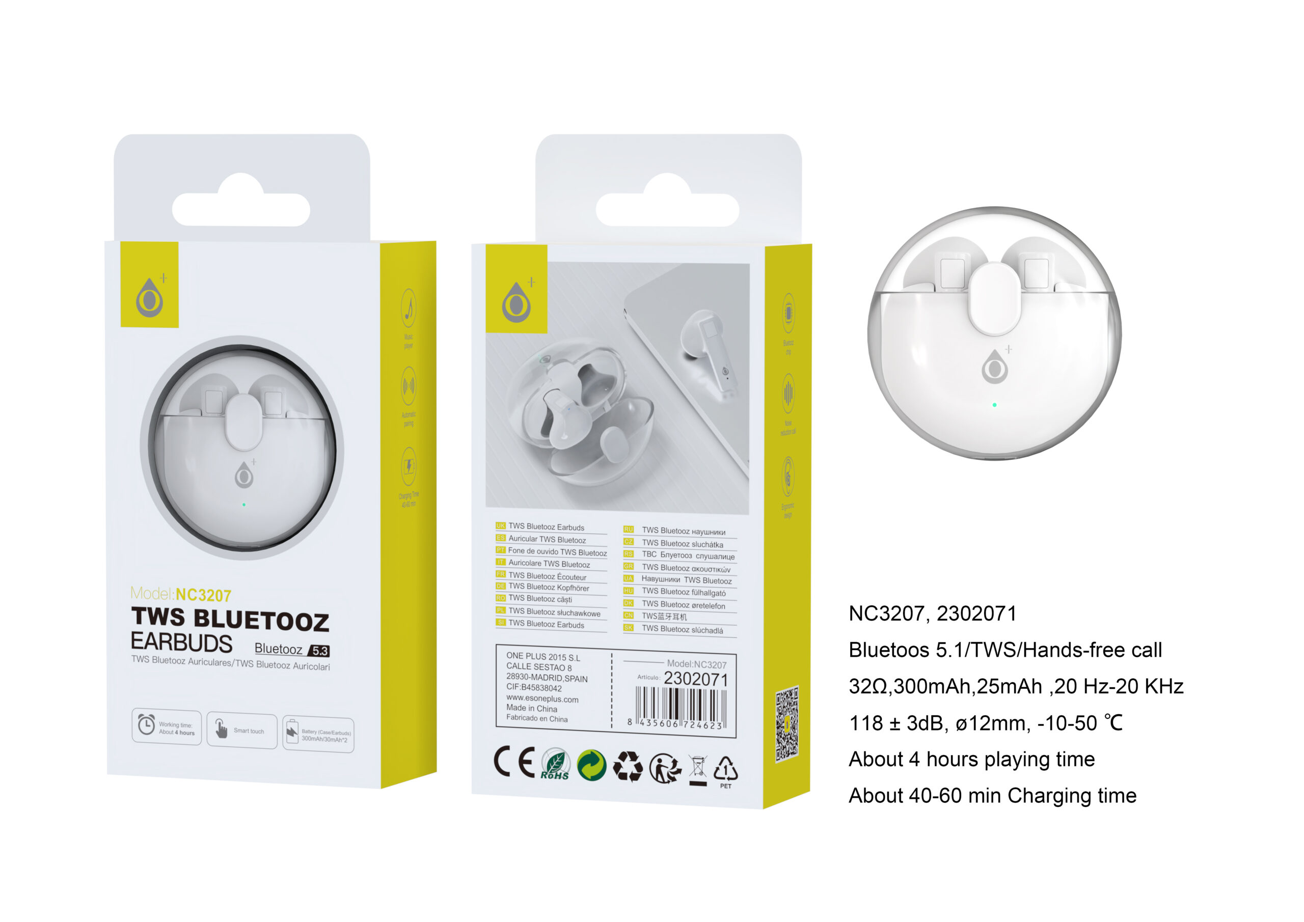 NC3207 BL Auriculares Bluetooth TWS (25mAh*2) con estuche cargable(300mAh). Blanco