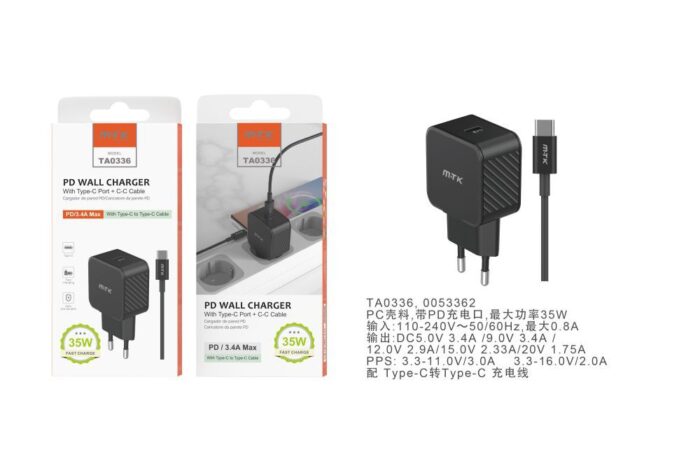 • TA0336 NE Cargador de Red Rapida Fay , 1 puerto PD, con Cable Type-C a Type-C, 35W/3.4A(Max), Negro