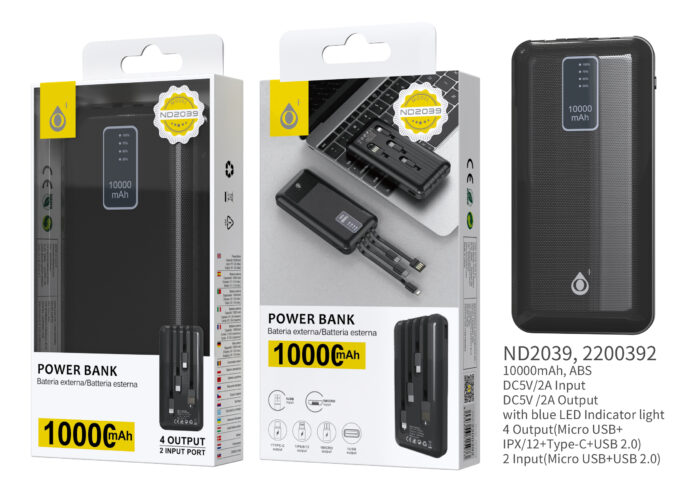 ND2039 NE Powerbank 10000mAh, 2 Entrada( Micro USB+USB), 4 salida (MicroUSB+ IP+ Type-C+ USB), con Indicador de LED Azul 5V, 2A, Negro