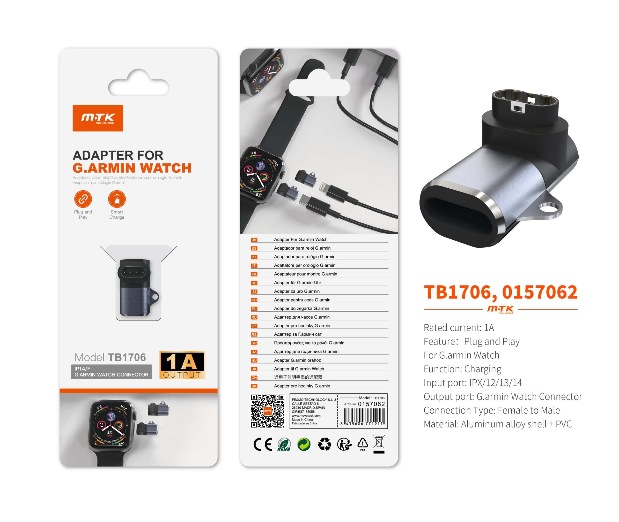 TB1706 GR Adaptador de carga Lightning para Reloj Garmin, 1A, Gris