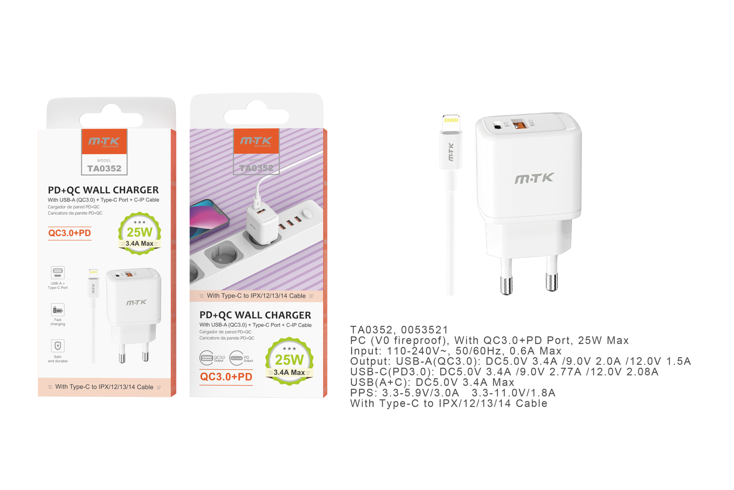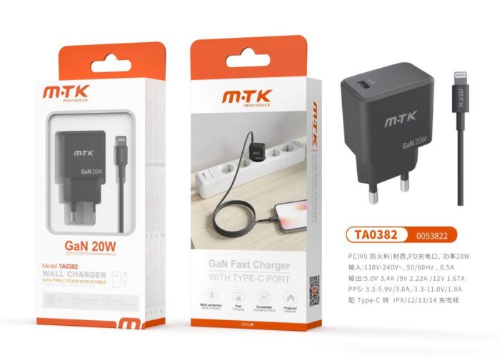 TA0352 BL Cargador de Red Rapida Taylor , 2 puerto (Type-C PD + QC3.0) , Con Cable Lightning , 25W/3.4A(Max), Blanco