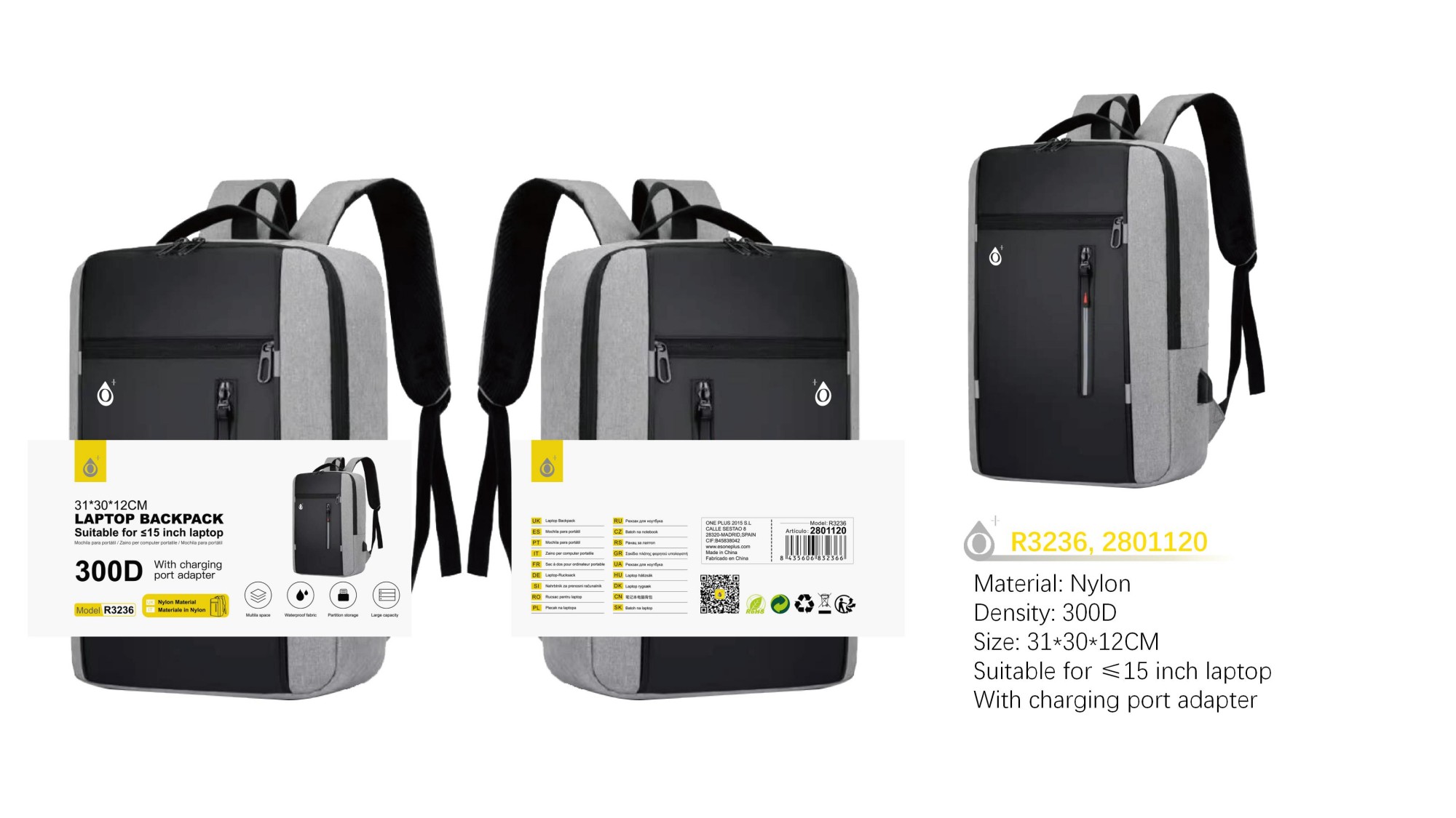 R3236 GR+NE Mochila de nylon 300D con salida de carga 31*30*12cm,  Soporta portatil ≤15pulgadas, Gris+Negro