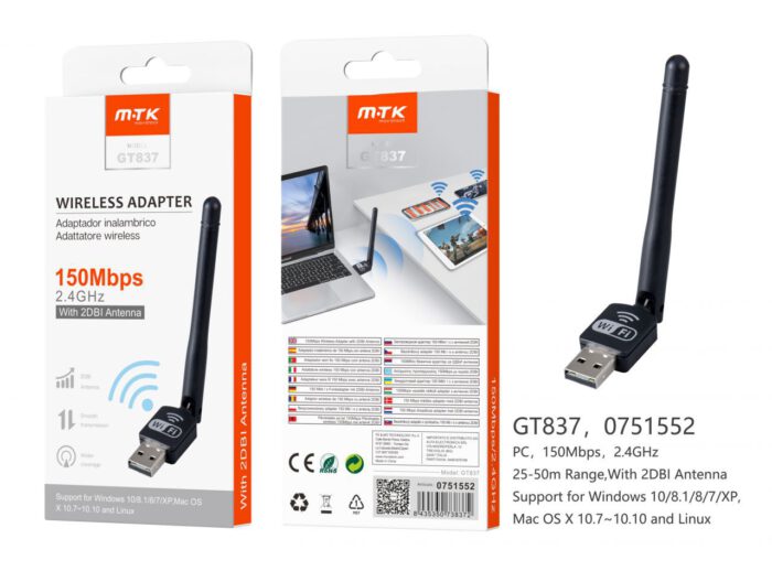 • GT837 Mini Adaptador Wifi - USB, con Antena 2DBI, 150Mbps Negro